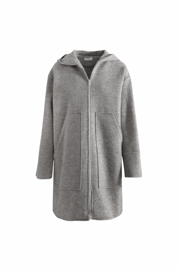 399,00 €Giacca lunga in lana di Maria Bellentani con zip, cappuccio e tasche frontali. Calda, elegante e versatile per look casual-chic. -